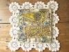 イエローのコースターに、水色とオレンジのレトロ・フラワーのプリントが入った、